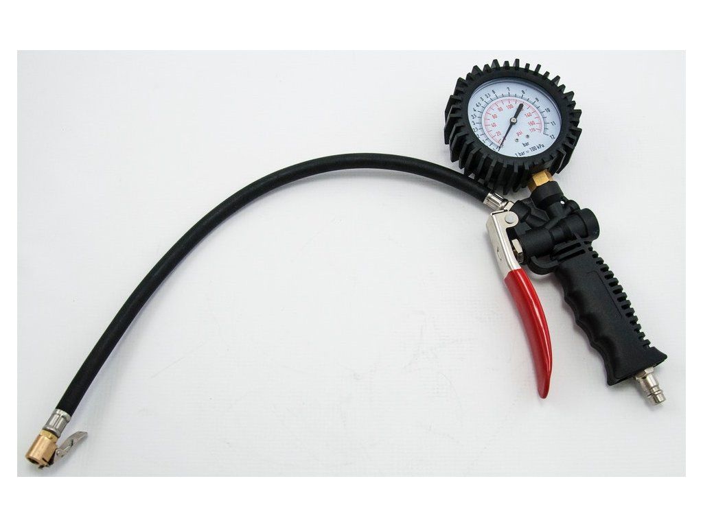 Pistoje na pneumatiky s manometrem a odpouštěcím ventilem, připojení pro rychlospojku. manometr, koncovka pro automobilový ventilek, hadička max . tlak 10Atm